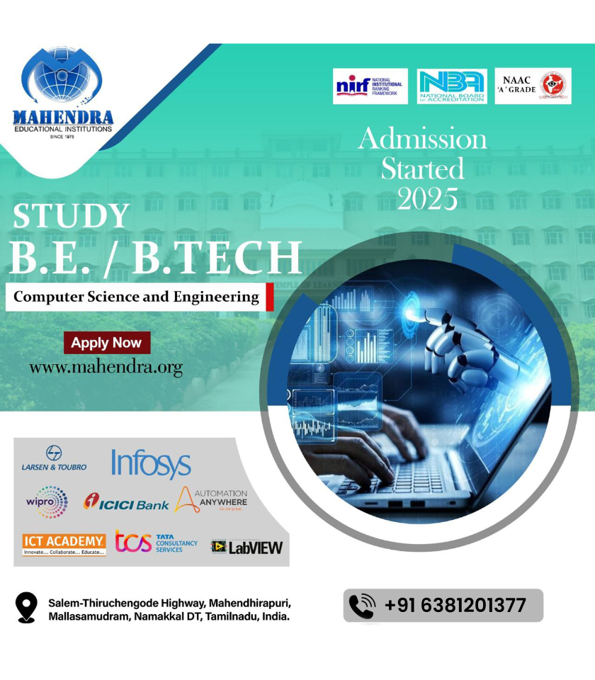 Join Mahendra Educational Institutions to pursue B.E. / B.Tech in Computer Science and Engineering, where innovation meets industry. Ranked and accredited by NIRF, NAAC A Grade, and more, Mahendra offers cutting-edge learning aligned with global tech needs.