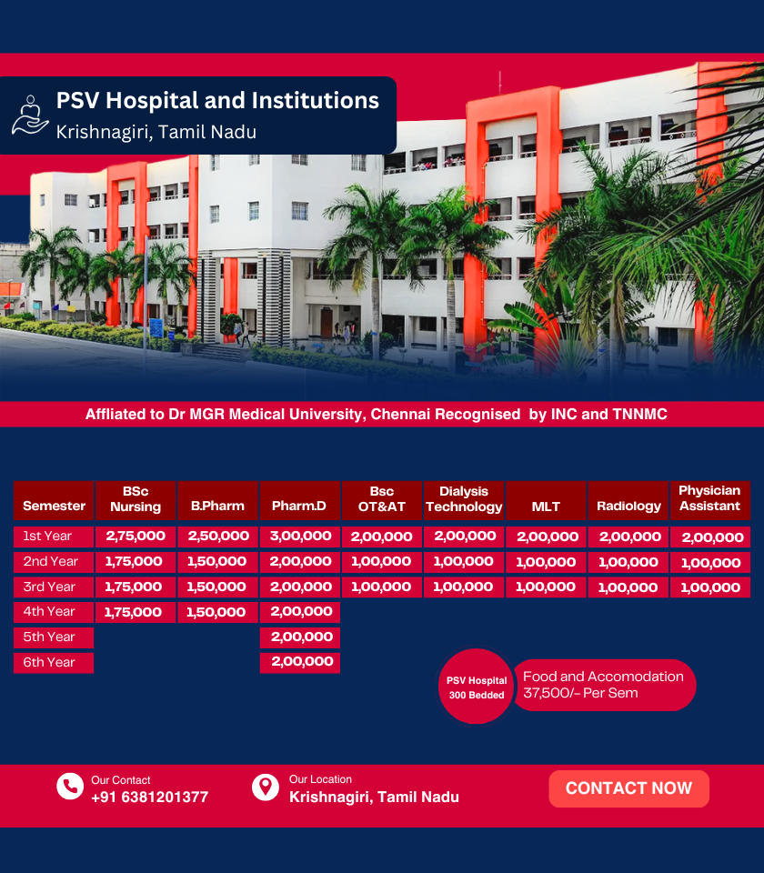 PSV Hospital & Institutions in Krishnagiri, Tamil Nadu, delivers comprehensive healthcare education through a variety of programs including B.Sc Nursing, B.Pharm, Pharm.D, OT & Anaesthesia Tech, Dialysis Tech, MLT, Radiology, and Physician Assistant.