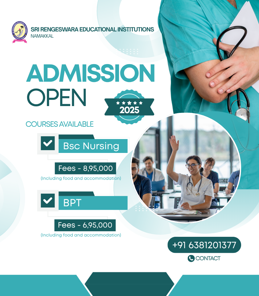 At Sri Rengeswara Educational Institutions, we offer professional courses in B.Sc Nursing and BPT (Physiotherapy) with full support including food and accommodation. Our 2025 admissions are now open for students ready to begin their healthcare career journey. We provide expert training, modern infrastructure, and a supportive environment to help you succeed in the medical field.